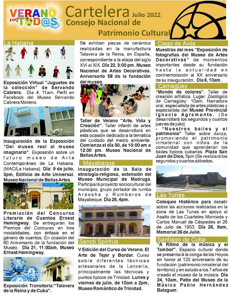 El Coro Nacional dirigido por la maestra Digna Guerra, brindará un concierto en la Biblioteca Nacional José Martí el 23 de julio a las 4 de la tarde y el pianista Huberal Herrera, estará presentándose en el Museo Nacional de la Música a la misma hora el día 27. .