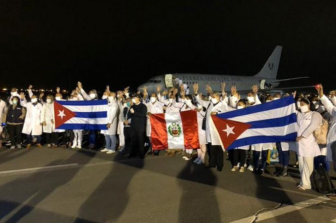 Colaboradores cubanos llegan al aeropuerto en Perú (Foto: Cuenta en Twitter de la Embajada de Cuba en Perú)