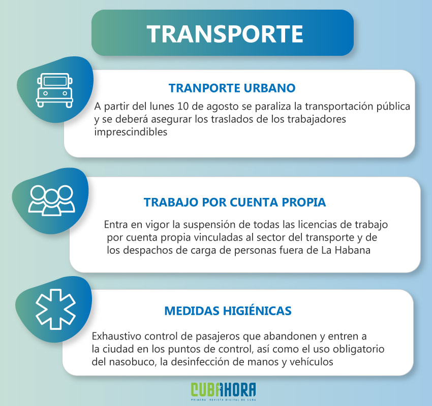 Por su parte, José Conesa González detalló que durante el fin de semana se mantendrá funcionando el transporte público hasta 8:00 pm, que se irá reduciendo gradualmente, hasta llegar al lunes 10 agosto cuando se suspende el servicio de ómnibus urbanos, así como taxis privados y estatales. De esta manera, se organizará la transportación del personal imprescindible que aporta servicios vitales a la población.