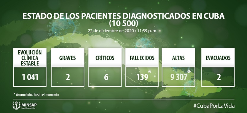 De los 10 mil 500 pacientes diagnosticados con la enfermedad, se mantienen ingresados mil 049 (9,99%), mil 041 (99,3%) con evolución clínica estable. Se reportan 139 fallecidos, dos evacuados, tres retornados a sus países, 88 altas del día, se acumulan 9 mil 307 pacientes recuperados (88,6%). Se atienden en las terapias intensivas ocho pacientes confirmados, de ellos 6 críticos y 2 graves.