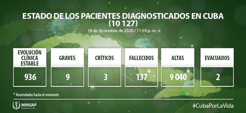 - Ciudadana cubana de 21 años de edad, del municipio Plaza de la Revolución, provincia La Habana. Caso con fuente de infección en el exterior. Se mantienen en vigilancia: 8 contactos.