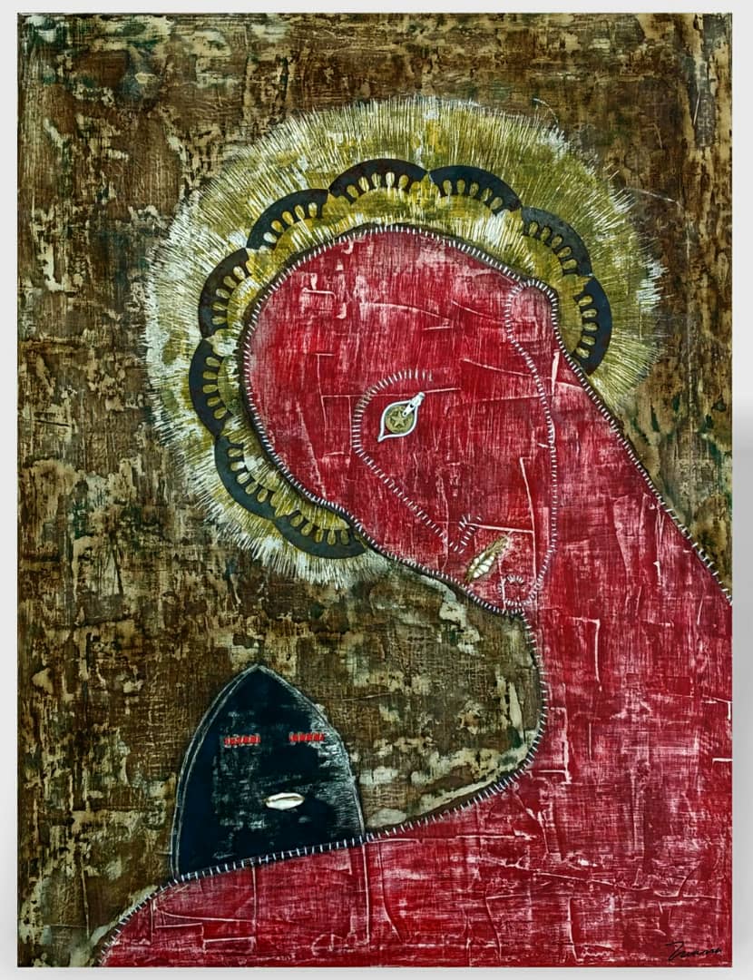 Adrián Gómez Sancho presentó una obra “con técnica mixta, en la que fusionó la base pictórica del fondo que tiene un sabor étnico con técnicas tradicionales como el uso de pasteles y acrílico, con materiales de uso común como monedas y un disco de vinilo.”