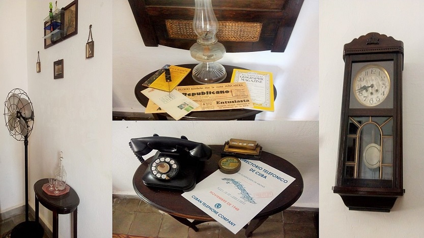“Encontramos la repisa y en la entrada de las salas una mesita para situar las cartas y publicaciones de 1948 (Selecciones del Reader's Digest, El Republicano, periódico matancero, y The National Geographic Magazine), el ventilador para refrescar el ambiente y la sombrerera con la bastonera. Destacamos el reloj, el teléfono y el directorio telefónico.