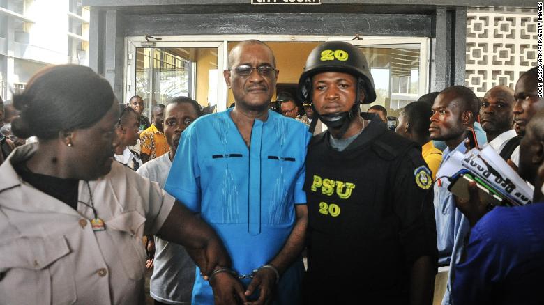 El exgobernador del Banco Central, Charles Sirleaf cuando escoltado y esposado abandonaba la corte en Monrovia durante las investigaciones por el delito de sabotaje económico. (Tomado de cnn.com).