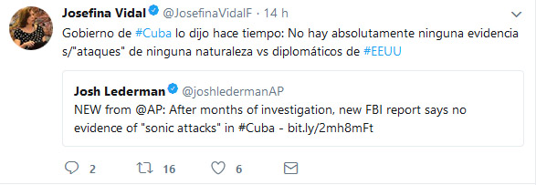 Reitero categóricamente que el gobierno cubano no tiene responsabilidad alguna en las afectaciones de salud reportadas por diplomáticos estadounidenses. Cuba nunca ha perpetrado ni perpetrará, ni ha permitido ni permitirá que terceros actúen contra la integridad física de ningún diplomático sin excepción. El gobierno cubano tiene conciencia de sus responsabilidades y las cumple de manera ejemplar.