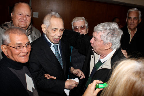 Orlando Bosh y Luis Posada Carriles se saludan efusivamente en el 2010 en la presentación de las memorias de Bosch. Cerca de ellos estaba Angel de Fana. Foto: Tracey Eaton