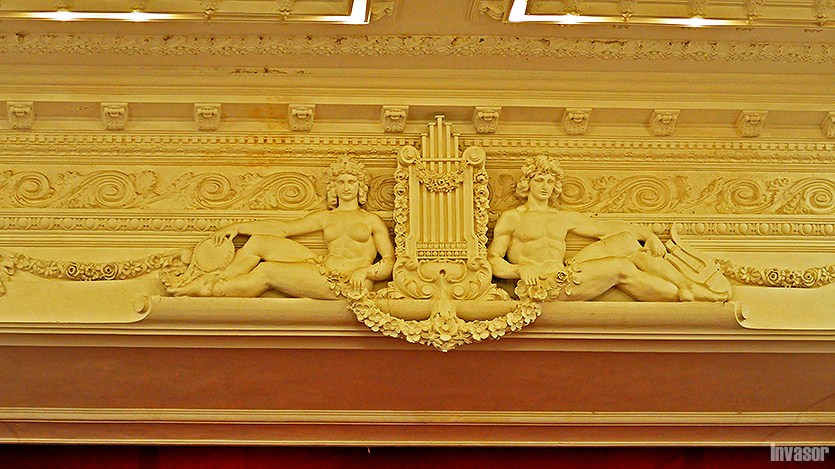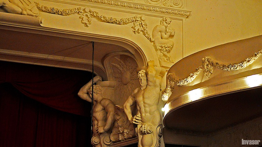 Atlantes que sostienen el arco del proscenio sobre los palcos del Teatro Principal.