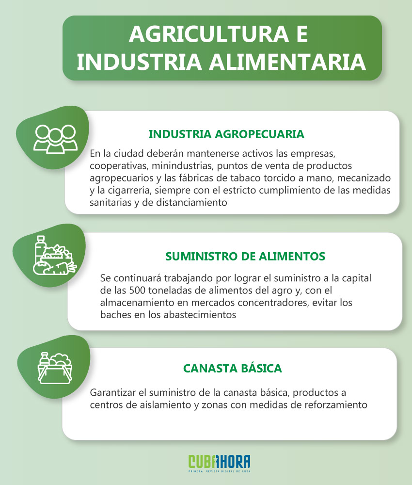 Mientras tanto, Julio Martínez enfatizó en la necesidad de mantener activas en la capital las empresas cooperativas, minindustrias, puntos de venta de productos agropecuarios y las fábricas de tabaco torcido a mano, mecanizado y la cigarrería. Por su parte, el sector de la Industria Alimentaria permanece trabajando, extremando las medidas en los centros de elaboración para que no ocurra ningún contagio.