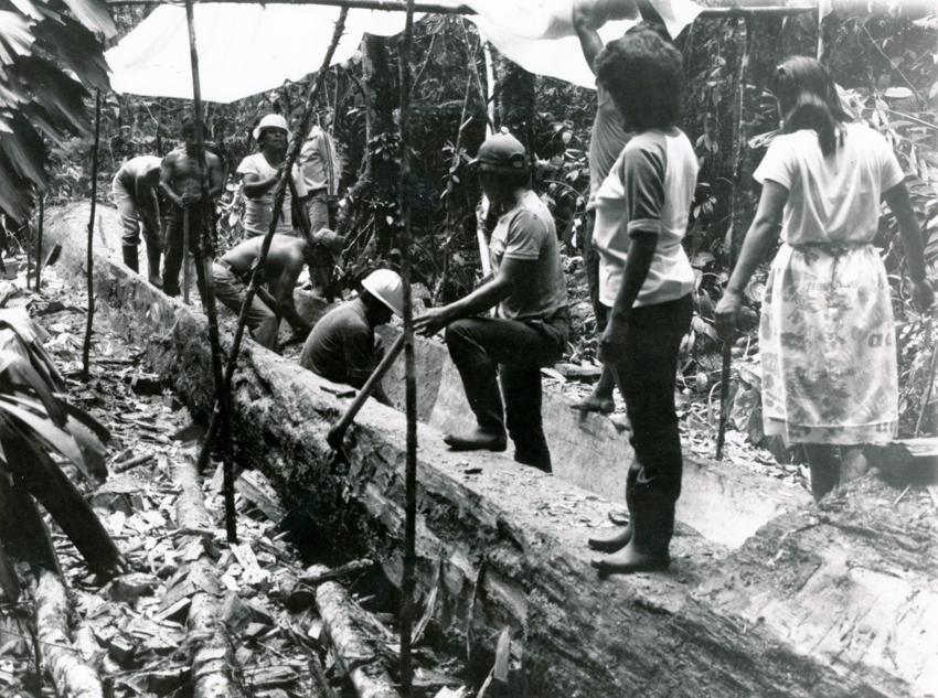 ”Una vez que ya está listo este proceso, viene el traslado de las canoas hacia las playas, lo que también fue otra odisea. Lenin era un hombre robusto, fuerte y era un poco el que garantizaba y pasaba la prueba de control porque se subía previamente a la canoa y él era un poco el que hacía la prueba de resistencia de dichas canoas. Finalmente las bajan a través de todo un periplo desde la selva hasta llegar a las playas de los ríos, donde se hace la comprobación de la flotabilidad de las canoas”.